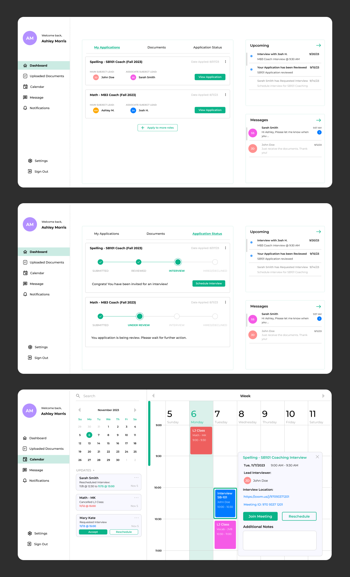 After implementing the feedback from the first iteration, my final designs address the core challenges of the hiring process. The updated interface streamlines the workflow to simplify and optimize the coach hiring process, addressing inefficiencies and reducing manual effort. It simplifies applicant tracking, improves filtering options, and integrates actionable steps into the platform.