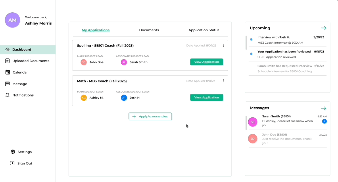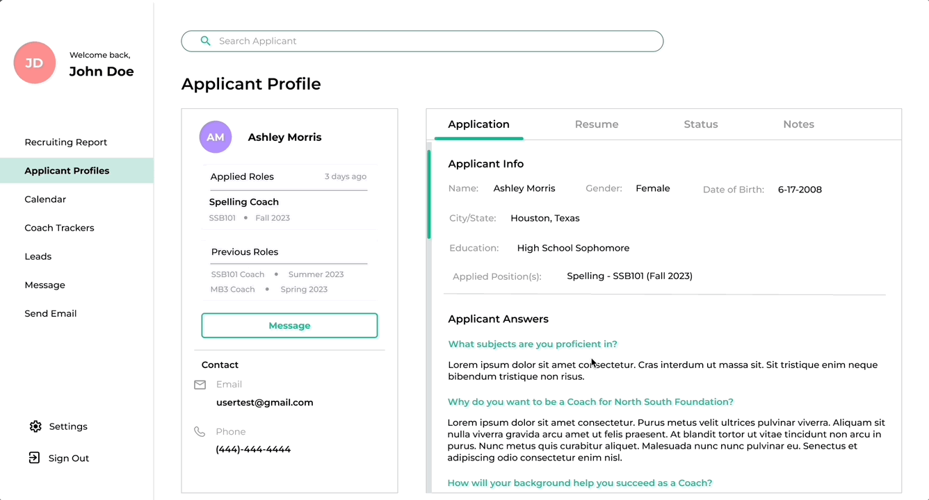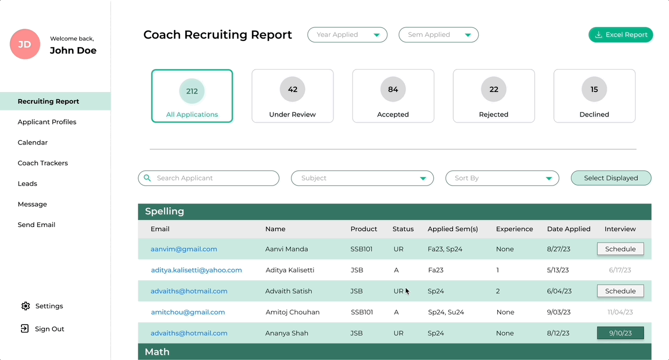 2. Tracking and Filtering: Applicants can be easily tracked and filtered by subject, hiring status, or custom sorting preferences. Their profiles also include previous coaching experience, enabling recruiters to assess qualifications quickly.