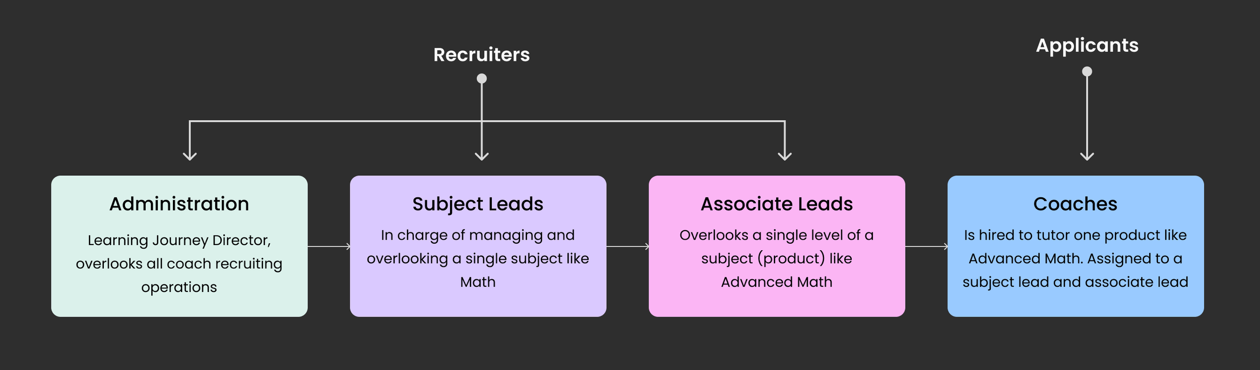 Understanding the hierarchy of operations is essential to designing a system that accommodates every level involved in the hiring process. Each tier—Administration, Subject Leads, Associate Leads, and Coaches—plays a distinct role in the hiring process with unique needs and responsibilities.