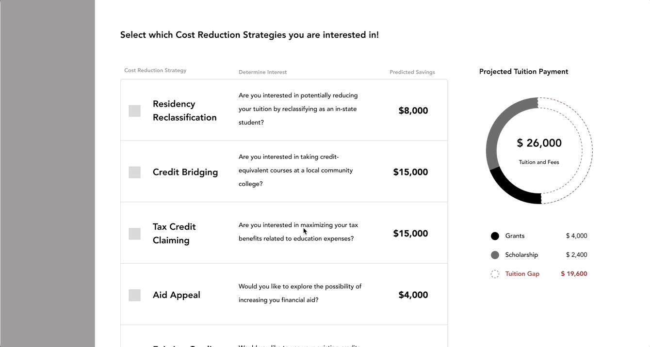 We updated the flow to guide students in proactively reducing tuition costs and debt by offering an interactive calculator, tailored savings strategies, and a simplified dashboard to track progress, encouraging clear, informed financial planning.